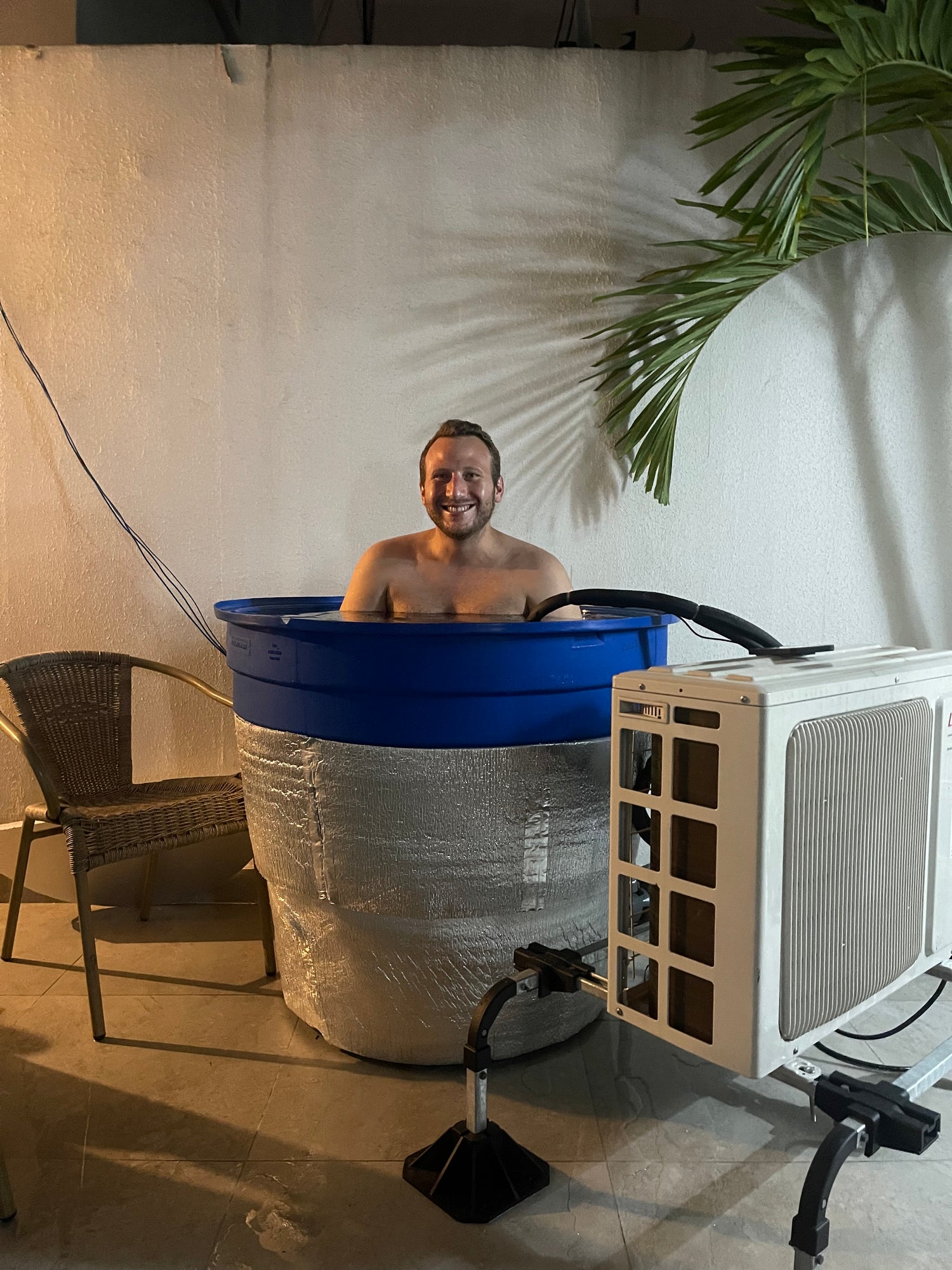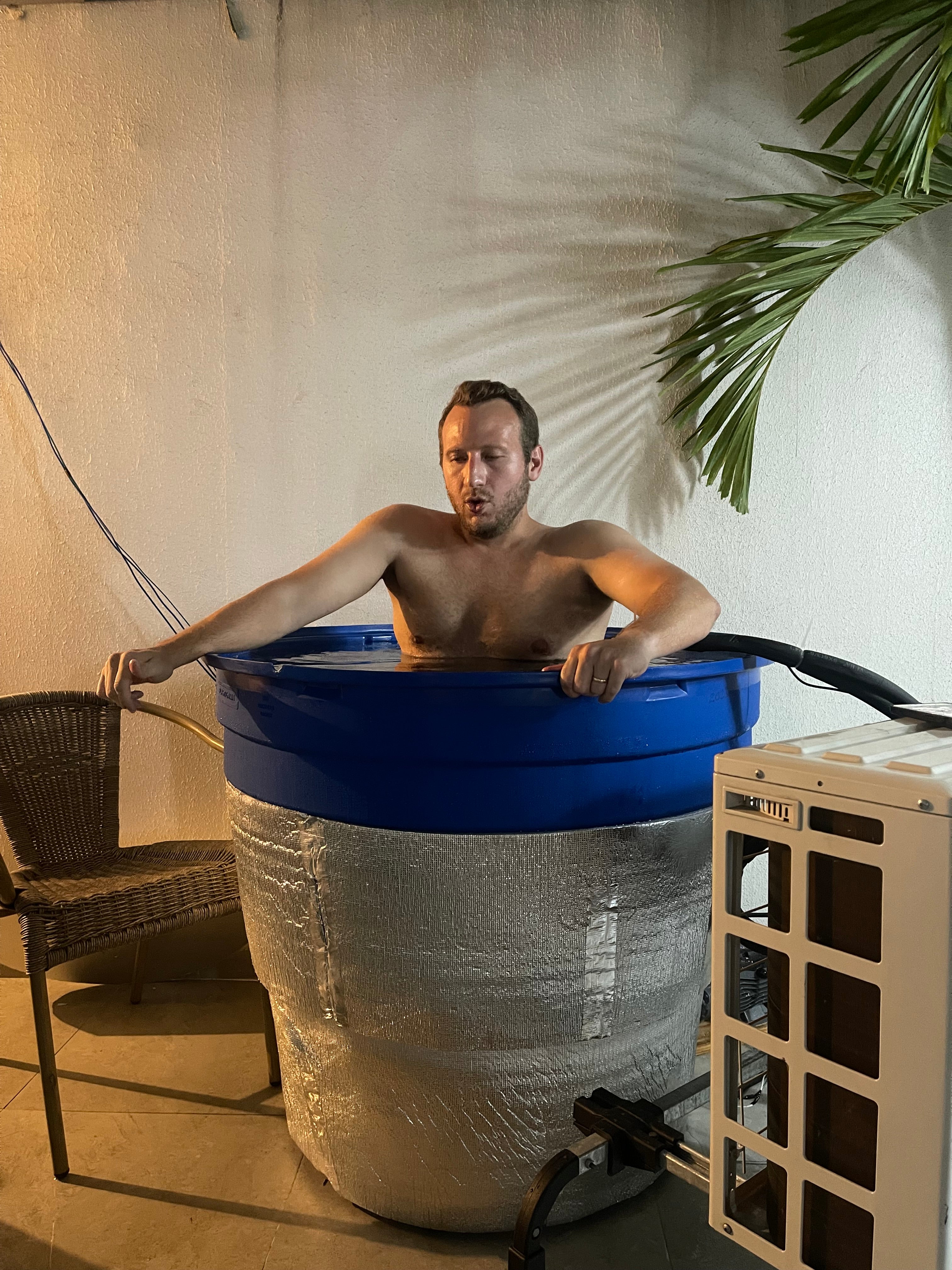 That’s when I turned to my dad, who runs an air conditioner company. We decided to make our own DIY cold plunge using some spare parts he had lying around. We rigged up a condenser and fan coil unit into a big water tank, threw in a chair, and voilà—our first cold plunge was born. It wasn’t the prettiest setup, but it worked. For the next version, I got a white acrylic tub and set up the cooling system in a separate container. It looked better and worked even better, and I started using it daily. Not only did I recover faster, but I also felt more alert and noticed my anxiety was way better.